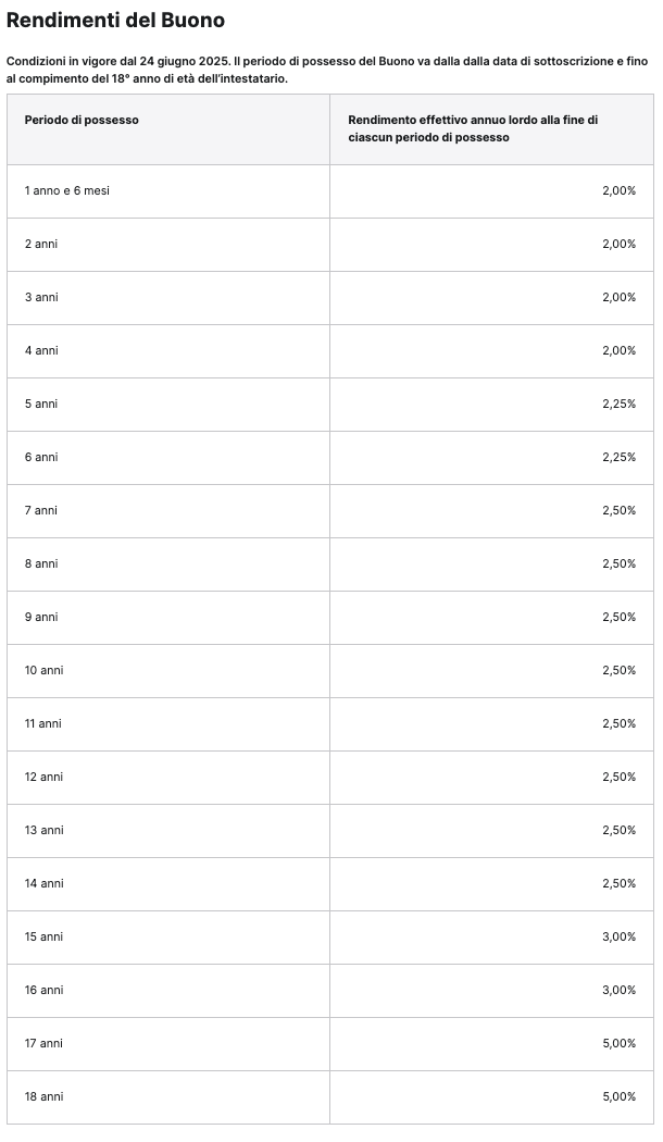 Il Buono infatti matura interessi fino ai 18 anni; il tasso è predeterminato in base all’età del minore e non varia per quella emissione, ma è bene tenere a mente che il rendimento effettivo a scadenza si aggancia al tasso del bimestre in cui cade il 18° compleanno.