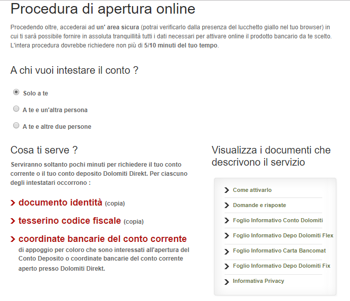 La documentazione da inviare alla Banca per l’apertura del conto consiste nel: modulo di Richiesta, il modulo standard per le informazioni da fornire ai depositanti, il contratto Depo Dolomiti Flex, una fotocopia del documento di identità in corso di validità, una fotocopia del codice fiscale.