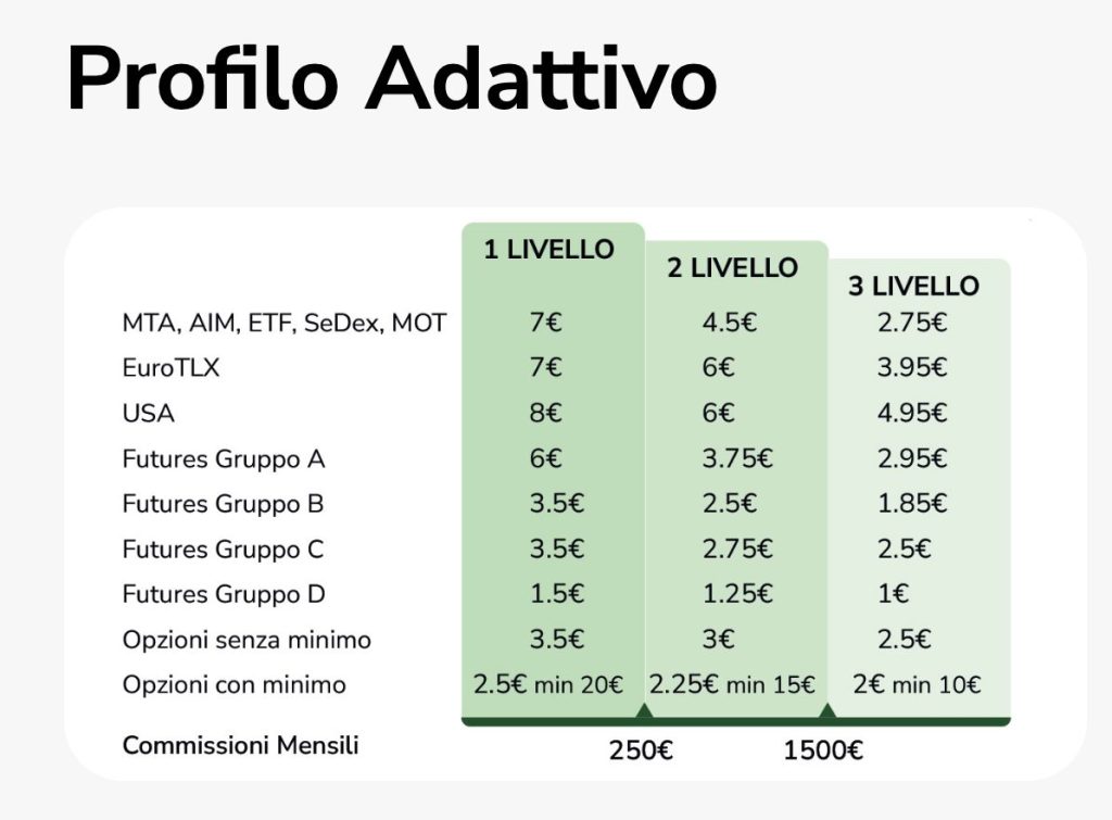 Avrai delle commissioni fisse adattive, che si adeguano al tuo livello di operatività; esse prevedono l’attribuzione di un livello commissionale in funzione dell’importo complessivo di commissioni che vengono generate nel mese precedente, fino a 1 euro per eseguito.
