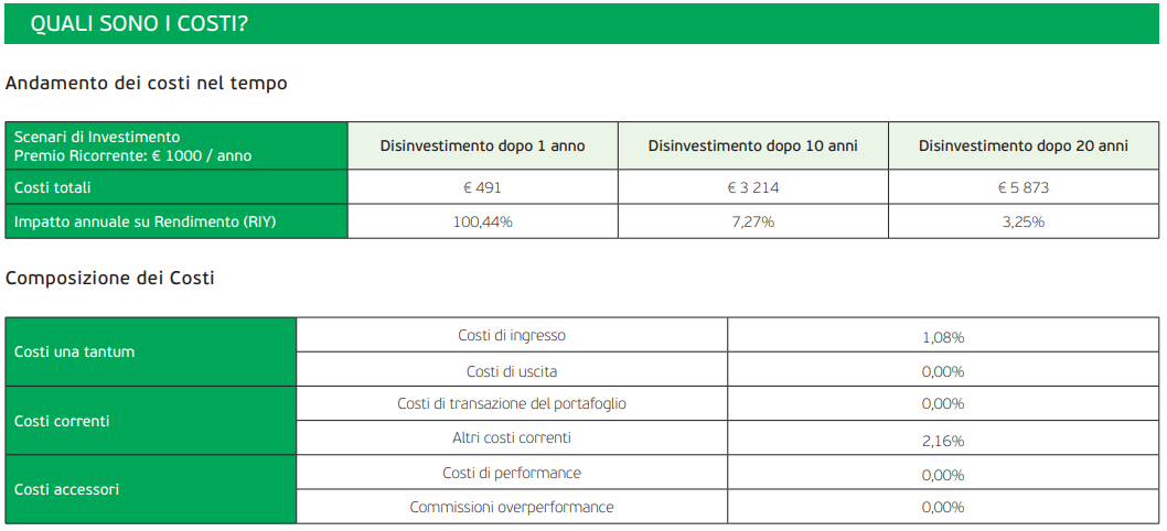 Sul foglio informativo viene riportato che i dati si basano, rispettivamente, su un’ipotesi di investimento di 1.000 euro annui. Gli importi sono ovviamente frutto di una stima e potrebbero quindi cambiare in futuro: cercherò di aggiornare la recensione.