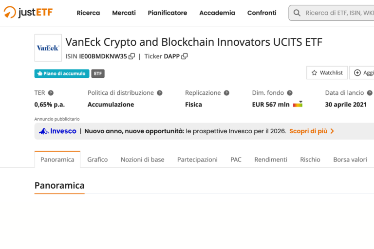 Se stai cercando delle informazioni su VanEck Crypto and Blockchain Innovators UCITS ETF, identificato con ISIN: IE00BMDKNW35 e ticker DAPP, in questa recensione indipendente analizziamo a fondo la struttura del fondo, l’indice replicato, la composizione per Paesi e titoli, i rischi e gli scenari del KID, soffermandoci in particolare sui