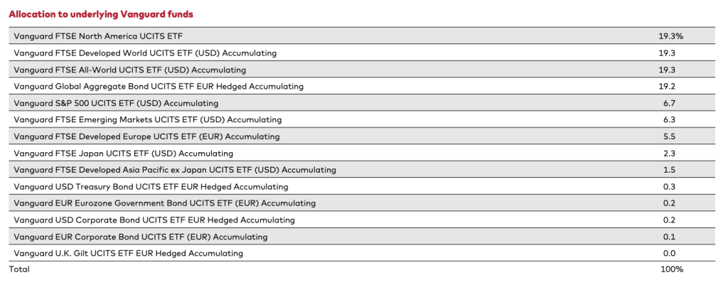 Il fondo ombrello Vanguard LifeStrategy 80% Equity investe in vari ETF a livello mondiale. Circa l’80% degli asset sono investiti in titoli azionari di mercati sviluppati ed emergenti. Il restante 20% è investito in obbligazioni. Gli emettenti provengono da mercati sviluppati ed emergenti, ma le obbligazioni sono sia denominate o coperte in Euro.
